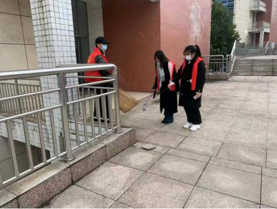志愿者在新一教二楼天台打扫卫生。同学们工作认真负责,各个角落里的小小纸屑“无处可逃”。