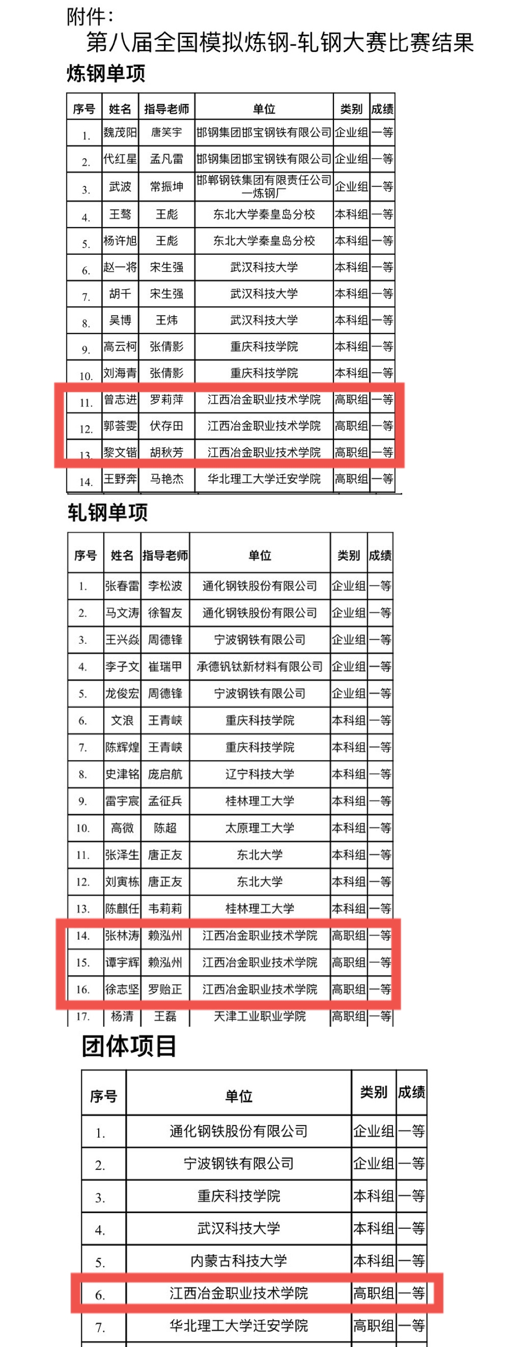 2022年12月,由中国金属学会主办的第八届全国模拟炼钢-轧钢大赛圆满闭幕,学院师生再创辉煌,炼钢单项中由罗莉萍、伏存田、胡秋芳老师指导的学生获3个一等奖,轧钢单项中由赖泓州、罗贻正老师指导的学生获3个一等奖,他们代表beat365英国官方网站斩获团体一等奖,这是高职组参赛单位中获得一等奖最多的队伍!