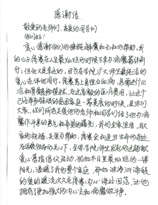 病魔无情,人间有爱。冶金工程学院师生的点滴付出汇成爱心的暖流,给廖赛同学无限力量,大家期盼着他早日恢复健康,重返温暖美丽的校园。