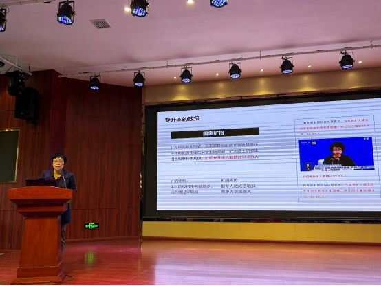 接着,胡秋芳老师从专升本的优势、特点、报考条件、报考建议等几个方面来进行说明,从近几年专升本政策的变化及未来的发展趋势进行讲解,通过对专升本历年数据对比,综合分析了专升本考试内容、招考院校、招生计划等情况。