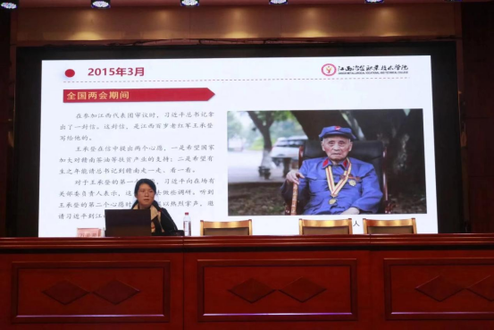 课堂上,万美茜结合学习贯彻习近平总书记考察江西重要讲话精神,对青年学生提出希望:青年强,则国家强。当代中国青年生逢其时,施展才干的舞台无比广阔,实现梦想的前景无比光明,要紧紧围绕新时代、新征程党的中心任务,完整准确全面贯彻新发展理念,牢牢把握江西在构建新发展格局中的定位,立足江西的特色和优势,奋力谱写中国式现代化江西篇章。