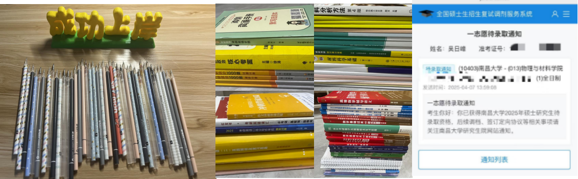 专升本的成功只是吴日峰逐梦路上的一个阶段性胜利,他将目光投向了更远大的目标——考研。他说:“专升本成功上岸后,我便下定决心考研”。然而,相对于专升本备考之路,考研之路显得更为艰辛。从酷暑到寒冬,从早七到晚十一,从教室到图书馆,吴日峰的复习之路从未停歇。在寒风中背书,脸颊被冻的通红,双手冰冷的已没有知觉,每翻一页便暗自告诉自己,离成功又进了一小步。“我没有什么诀窍,就是坚持,记不住就多写,写一遍不行写十遍,十遍不行,三十遍”。复习期间,吴日峰遇到了诸多困难。最让他印象深刻的是,一边发着烧一边坚持在看书。那种滋味现在回想起来都很难受,唯有坚持,才有希望。最终,经过无数个日夜的努力和坚持,吴日峰顺利通过初试和复试,收到了南昌大学的录取结果。那一刻,他的眼泪夺眶而出,“所有的努力和付出,都在这一刻得到了回报”。吴日峰感慨不已。