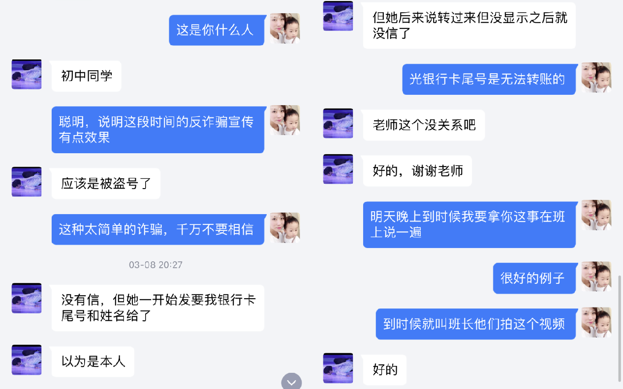 随后,班主任在班里开展教育,并将此事向分院做了汇报。分院以此为预防电信诈骗的典型案例,在所有班级进行了宣传。身边的真人真事为分院师生上了一堂生动的教育课。