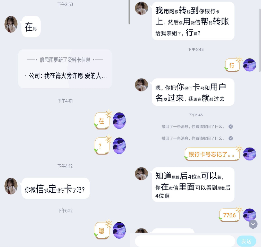 【制造工程学院王雨报道】2022年3月8日晚,制造工程学院的施斌新老师收到了学生小李发来的QQ消息:“老师,有人想诈骗我!”施老师看到这条信息,立刻紧张起来,立即向小李同学了解事情的经过。