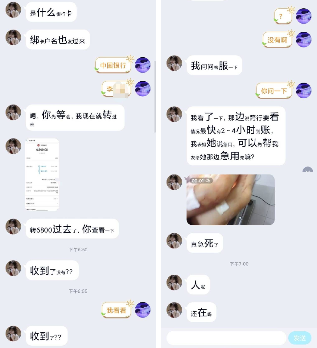 小李同学一五一十的向施老师讲述事情的经过,小李的初中同学廖某突然QQ联系到他,说自己的姐姐出了车祸,现在在医院,因为事情紧急,姐姐身上没有太多钱,自己也只有网银上有钱,在医院无法使用,希望小李帮忙用微信转六仟八佰元。为了消除小李同学的顾虑,廖某还表示会先将网银的钱转到小李同学的银行卡上。