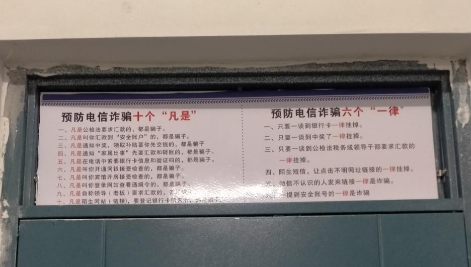 通过观察,宣传板放在宿舍门上玻璃处是最合适的。因为有学生反映晚上睡觉时,门外的光会透过玻璃,影响学生睡眠,很多寝室会将纸壳挡在玻璃处。为此结合本次反诈宣传,分院决定,将宣传板按照门上玻璃的尺寸设计,固定安装。宣传板安装好后,学生纷纷表示,这个反诈宣传很惊喜,同时又很贴心,不仅解决了晚上灯光问题,还起到提醒作用,一举两得。