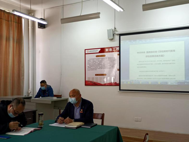 会上,黄贤振带大家集中学习中共中央、国务院下发的《深化新时代教育评价改革总体方案》。黄老师阐述了《总体方案》的指导思想、深刻内涵和目标任务。他提出评价改革不仅是学生评价改革,更涵盖了教师评价改革,评价改革的根源是课程改革,未来课程考核方向将以职业资格证书、职业技能等级证书考核为主。