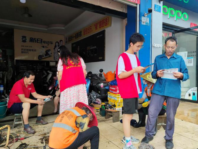夏季天气炎热,用电量激增,火灾隐患多,火灾易多发,因此夏季预防火灾也尤为重要。队员张宝文向维修店大叔普及防火安全知识,讲解家庭防火措施,以及居家或外出时如何安全用电用火。队员王发权也向居民宣传突发火灾时的应急避护措施。