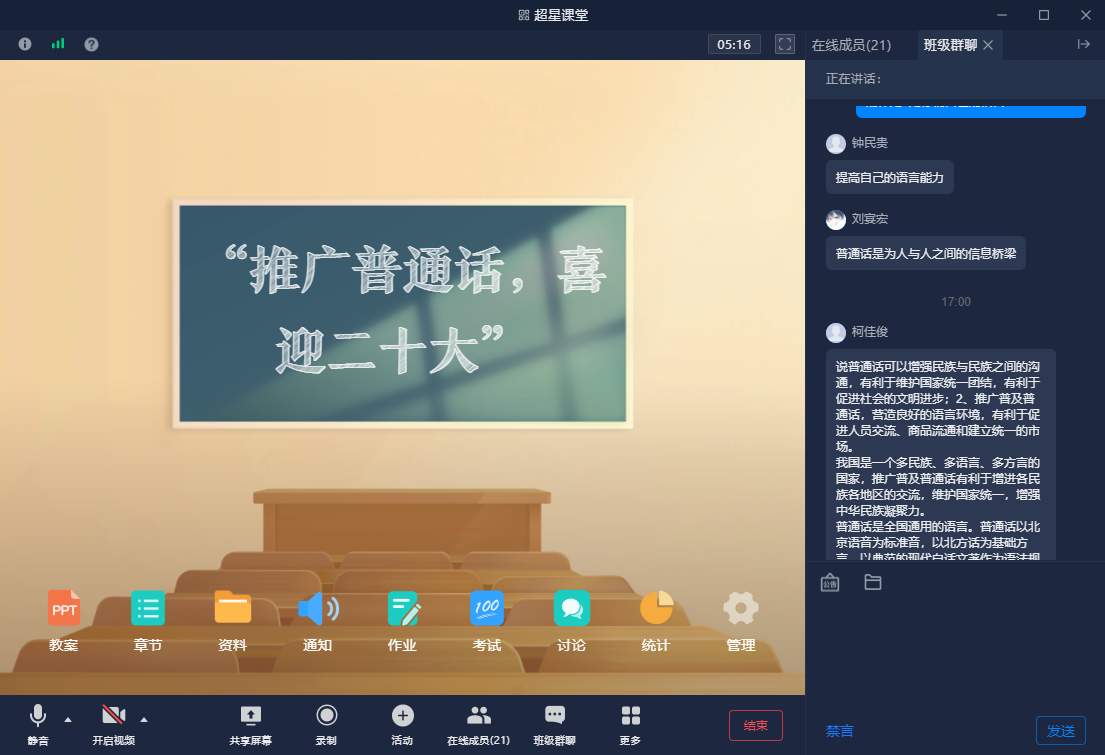 语言是一个民族的声音,是人与人沟通的桥梁。我国是多民族、多语言、多方言的人口大国,推广普及普通话有利于增进各民族各地区的交流,有利于维护国家统一,增强中华民族凝聚力。班会期间,各班组织学生朗诵中华诗词,分享关于普通话的小知识,带大家了解使用规范字的好处,还组织学生分享对普通话的心得体会。