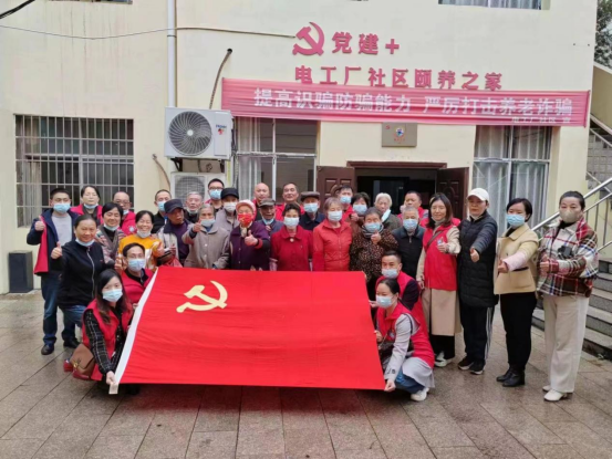 在电工厂社区颐养之家,全体党员在党支部副书记邓纪纲带领下,为老人们送上了牛奶、水果和饼干等慰问品。邓纪纲亲切地与老人们交谈,询问他们的起居饮食和生活情况,祝他们身心健康、福如东海、寿比南山。支部其他党员纷纷以实际行动表达对老人们的关怀,有的帮助老人打扫房间卫生,有的帮助老人整理食堂桌椅,有的为老人疏通心理困惑。每到一处都能看到大家开心忙碌的身影,大家热火朝天、干劲十足,把温暖和快乐带给了老人。