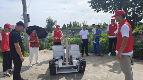 这台机器人正是制造工程学院芝麻开花乡村振兴团从学校带来的“绿地精灵”。巢以轩是“绿地精灵”项目小组成员,据他介绍:经过前期产品调研、设计、制作、调试和研发,“绿地精灵”可以在半干旱环境下种植杆状幼苗。“绿地精灵”建立了智能控制系统,使用了STM32开发板作为硬件平台,利用模糊免疫 PID 算法进行电机调速,提升了系统稳定性及抗干扰能力。“绿地精灵”可以完成钻孔、下料、插苗入孔、拢土压实、浇水等操作,行走平稳,转向灵活,充满电可以工作10小时,幼苗成活率超过90%,对农业作业大有裨益。