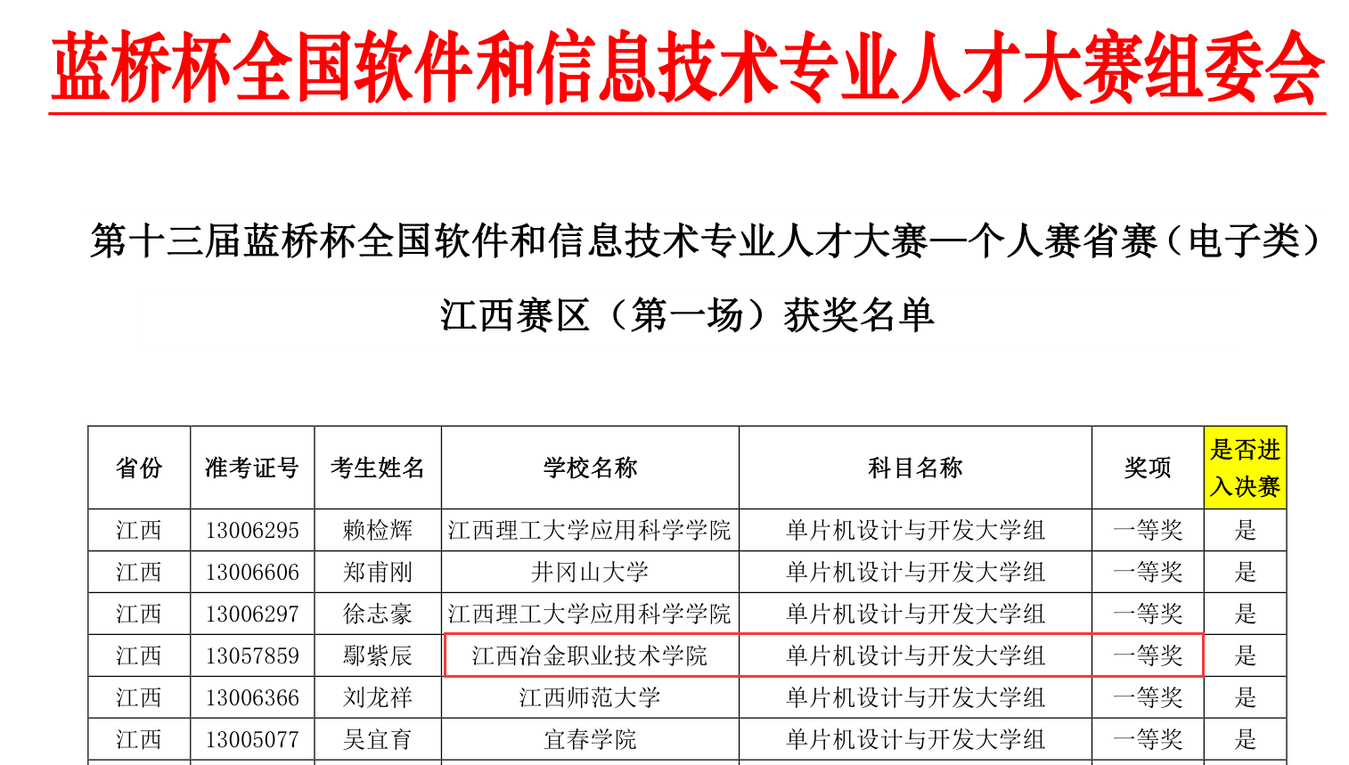 从蓝桥杯大赛官网获悉鄢紫辰同学在2022年4月9日参加的单片机设计与开发竞赛项目荣获大学组荣获大学组省级一等奖第四名,进入全国总决赛的资格。目前他正按照备赛计划有条不紊地克服一个个困难,完成一个个训练任务为参加全国的技能竞赛做好充分的思想和技术准备,他用潜心备赛的实际行动为抗疫加油,传递着无声抗疫的正能量。