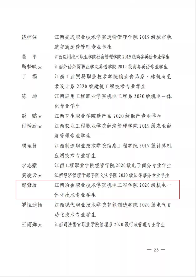 4月30日,共青团江西省委发布《关于表彰2021年度“全省优秀共青团员”“全省优秀共青团干部”“全省五四红旗团委(团支部)”的决定》。电气工程学院20级机电一体化技术大专1班鄢紫辰同学荣获“全省优秀共青团员”荣誉称号。