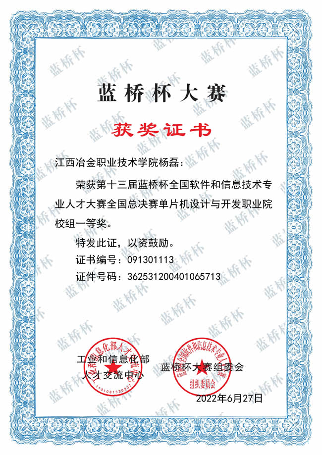 2022年6月27日,从蓝桥杯大赛组委会官网获悉,学院杨磊同学荣获2022年第十三届蓝桥杯全国总决赛单片机设计与开发职业院校组一等奖。这是江西省在单片机设计与开发职业院校组唯一的国赛一等奖。鄢紫辰、刘永文同学荣获二等奖,洪嘉豪荣获全国总决赛EDA设计与开发大学组二等奖,竞赛成绩相比往年有较大突破,同时学院被评为优秀组织单位。