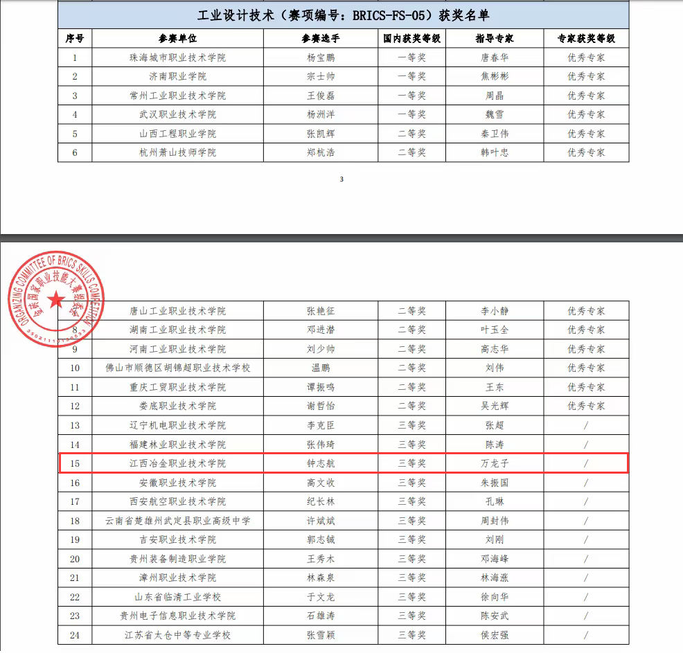 2022年11月1日至6日,2022金砖国家技能发展与技术创新大赛在厦门举办。电气工程学院万龙子指导的钟志航同学在“工业设计技术”赛项中获得三等奖(第15名)。