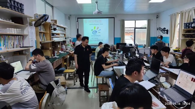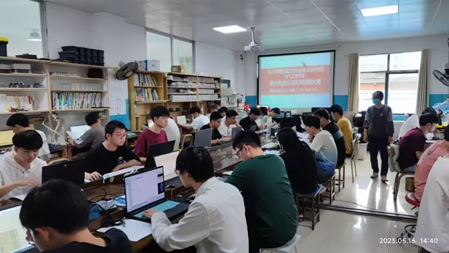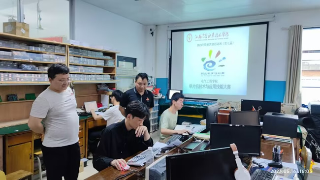 根据《2023年beat365英国官方网站职业教育活动周(第九届)实施方案》,2023年5月16日,电气工程学院在刘星慧电子技术工作室举办了2023年第五届单片机技术与应用技能大赛,来自电气自动化技术、机电一体化技术、电子技术应用等专业的中、高职学生47人参加了竞赛,学院院长郭志江、副院长彭全、教务处长何志昌、电气工程学院院长黄锦文、教务科长刘亚弘等领导巡考。