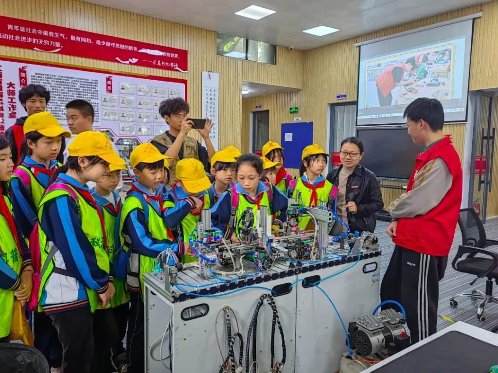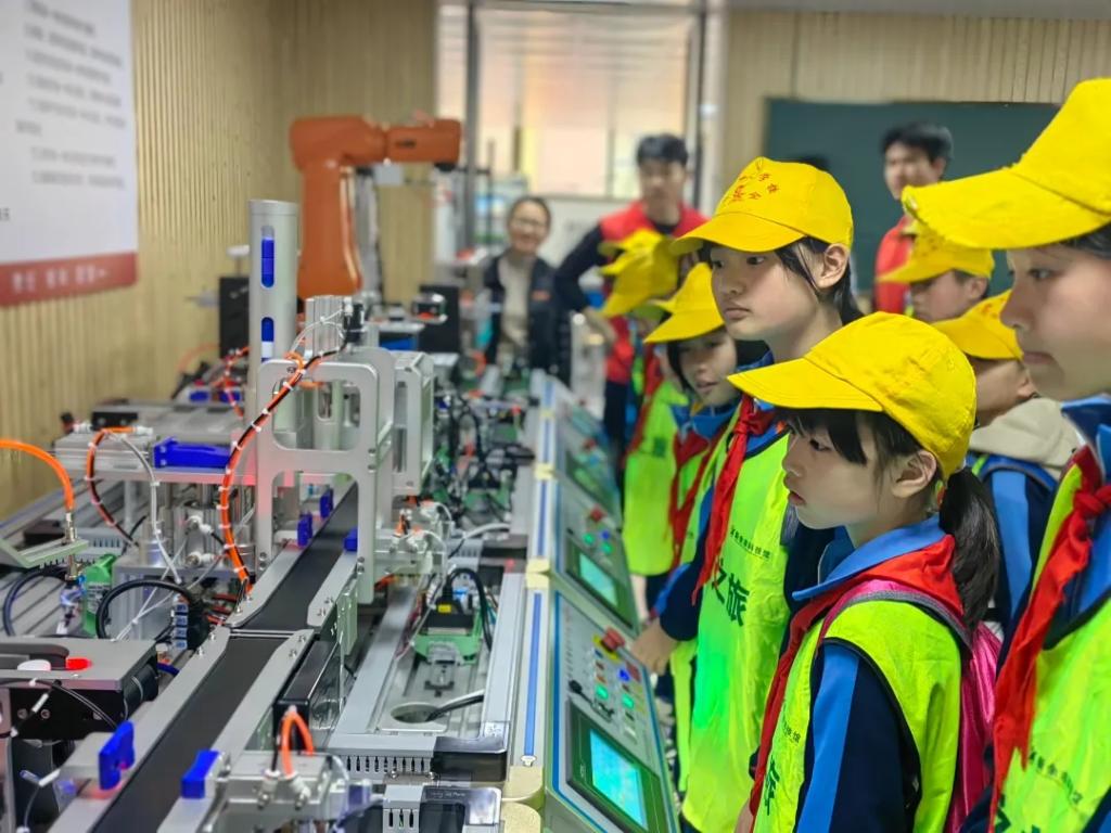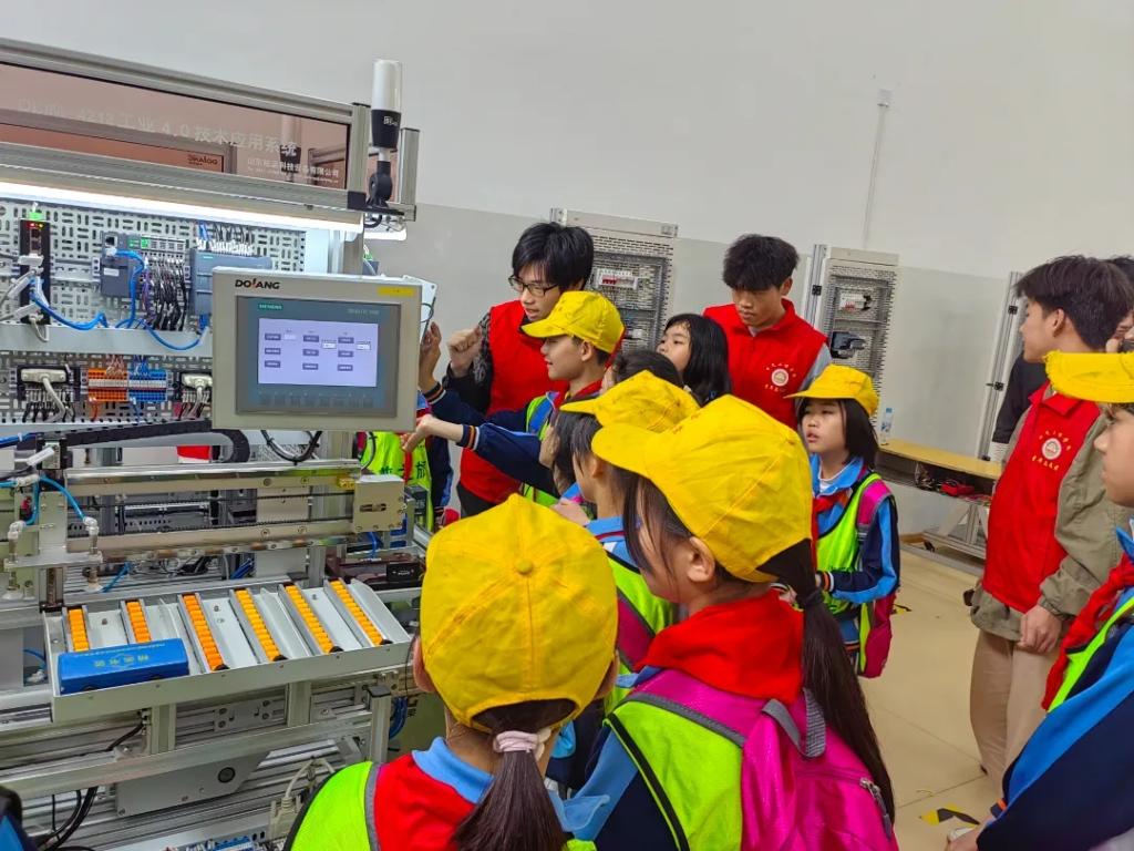 “这是一条不需要人工参与的生产线吗?”“有个物料瓶的盖子没有拧紧,分拣的路径和其他的不一样,这是怎么做到的呢?”“自动化生产真的只需要在触摸屏界面上简单操作就可以吗?”这是小学生们观摩机电一体化实训平台,听黄辉大师工作室成员讲解时发出的疑问。