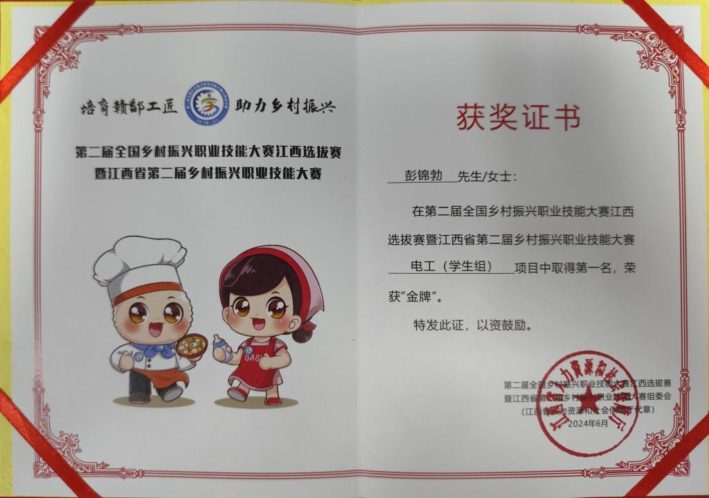 龚小辉老师在省赛电工(职工组)项目中取得第二名,荣获“银牌”,并被授予“江西省青年岗位标兵”和“江西省技术能手”称号。