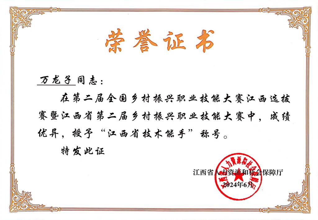 万龙子老师在省赛农机修理工(职工组)项目中取得第四名,获得优胜奖,并被授予“江西省技术能手”称号。