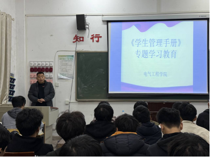2024年11月26日,电气工程学院组织各班级开展学习《学生管理手册》主题教育班会活动,以培养学生的规则意识,提高学生自我教育、自我管理的能力。班会由各班辅导员(班主任)主讲,全体学生参会。