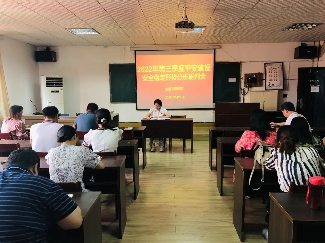 2022年9月26日,智能工程学院在博学楼103党员活动室,组织全院辅导员、班主任、学管干事召开了第三季度平安建设暨安全稳定形势研判会。分院副院长吴钰琳传达了学院第三季度校园平安建设暨安全稳定形势分析会的会议精神。