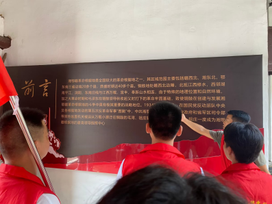 7月25日,幽居村的青山里有一抹红色掠过,在泥泞的山路上,“自找苦吃”实践队师生一行20人正大步行进着,前往位于五公里外的大梅村的湘鄂赣省苏维埃政府旧址及省军区司令部旧址等地开展走读学习,追寻红色印记,传承革命精神。