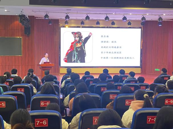 2024年1月5日,在图书馆二楼报告大厅的舞台上,一位身披斗篷,头戴方巾毡帽的表演者用他干脆利落的动作不断变换着脸谱,现场响起掌声。表演者是独腿拐杖变脸达人张东海。他来到学校,分享自己的成长历程,带来精彩的川剧变脸表演。台下的观众是来自智能工程学院的近300位学生。