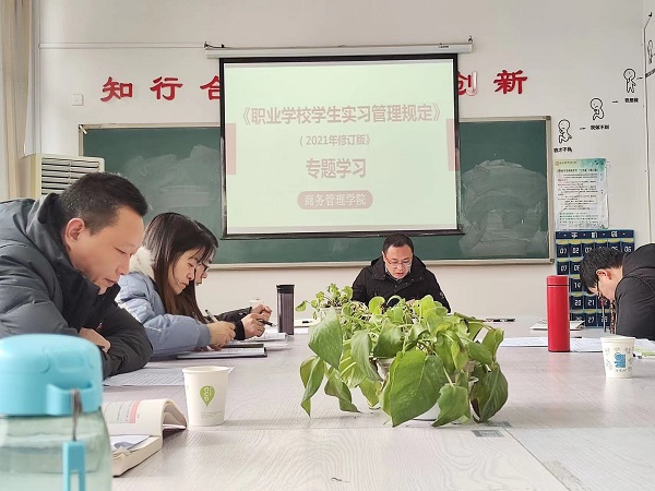 随后,郭斌再次与教师们一起学习了《职业学校学生实习管理规定》。他讲到,我们要坚守实习育人初心,严守实习管理规定,主动适应新形势下实习管理新要求,积极探索实习管理提质培优新途径。