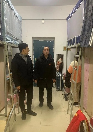 为切实做好校园疫情防控工作,了解返校学生思想动态,进一步了解和指导学生新学期学校生活,2022年2月24日返校当晚,商务管理学院党支部副书记唐毓林带领全体辅导员、班主任,深入学生宿舍,检查宿舍内务、安全,关心同学们的健康和生活。