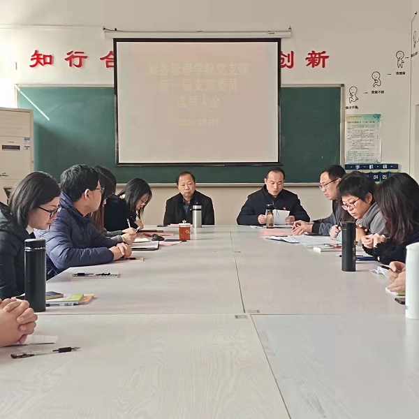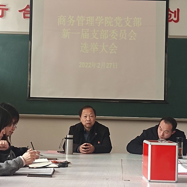 2022年2月27日上午10点,商务管理学院党支部召开支部党员大会,选举产生了新一届支部委员会。挂点院领导李茂旺出席会议,学院党委组织部副部长邬金凤应邀参加会议。唐毓林主持会议,全体党员参加。