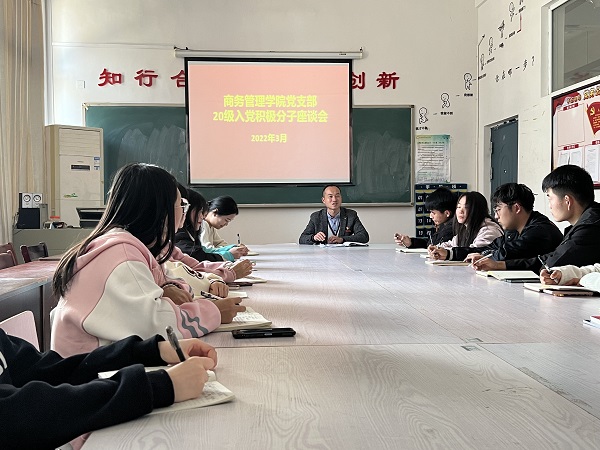 2022年3月9日下午,在新三教208党员活动室,商务管理学院党支部召开了20级大学生入党积极分子学习会。会议由宋薇老师主持,分院党支部副书记唐毓林出席了会议。全体入党积极分子参会。