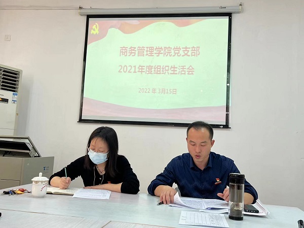 3月15日,在新三教208党员活动室,商务管理学院党支部召开了2021年度组织生活会暨民主评议党员会。会议由党支部副书记唐毓林主持,学院党委组织部副部长邬金凤应邀出席,全体党员参会。