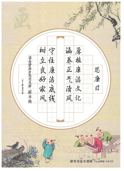 随后,参会党员代表围绕通报的典型问题和学习内容,联系自身实际,进行了热烈的讨论和交流。支委成员带头进行了发言,凌果老师谈到,家风是作风的催化剂,好家风是好作风的营养剂,家风正则作风淳,我们要用实际行动构筑反腐倡廉的家庭防线。张华鹏老师为活动创作了书法作品《思廉日》。