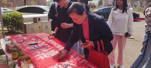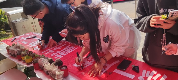 分院团总支为活动参与者精心准备了春日特别礼物多肉、绿萝与仙人球。活动现场,大家通过朋友圈宣传集赞、参与三日低碳打卡与现场知识问答,认养自己心仪的绿植,并在横幅上郑重签下自己的名字。整个活动有序进行,大家积极热情。短短一个小时内,每一份绿植都找到了自己的新家,相信它们会在新主人的陪伴和悉心照料下能茁壮成长,为环境保护作出小小的贡献。