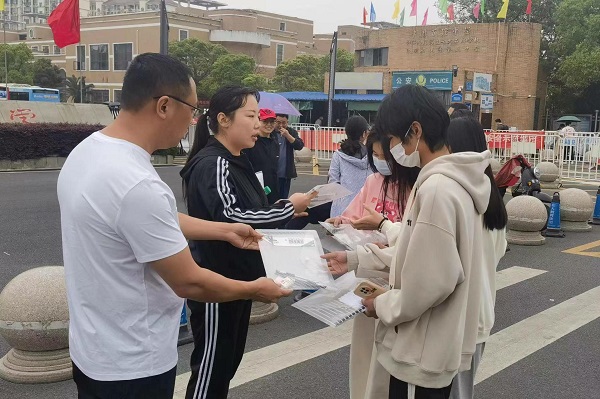 考场门口,大家为考生们派发助力加油包,勉励他们坚定目标、放松心态、诚信考试,预祝同学们金榜题名、成功上岸。虽然现场阴雨绵绵,但老师们的加油鼓劲给同学们带来了温暖,缓解了大家的紧张情绪。