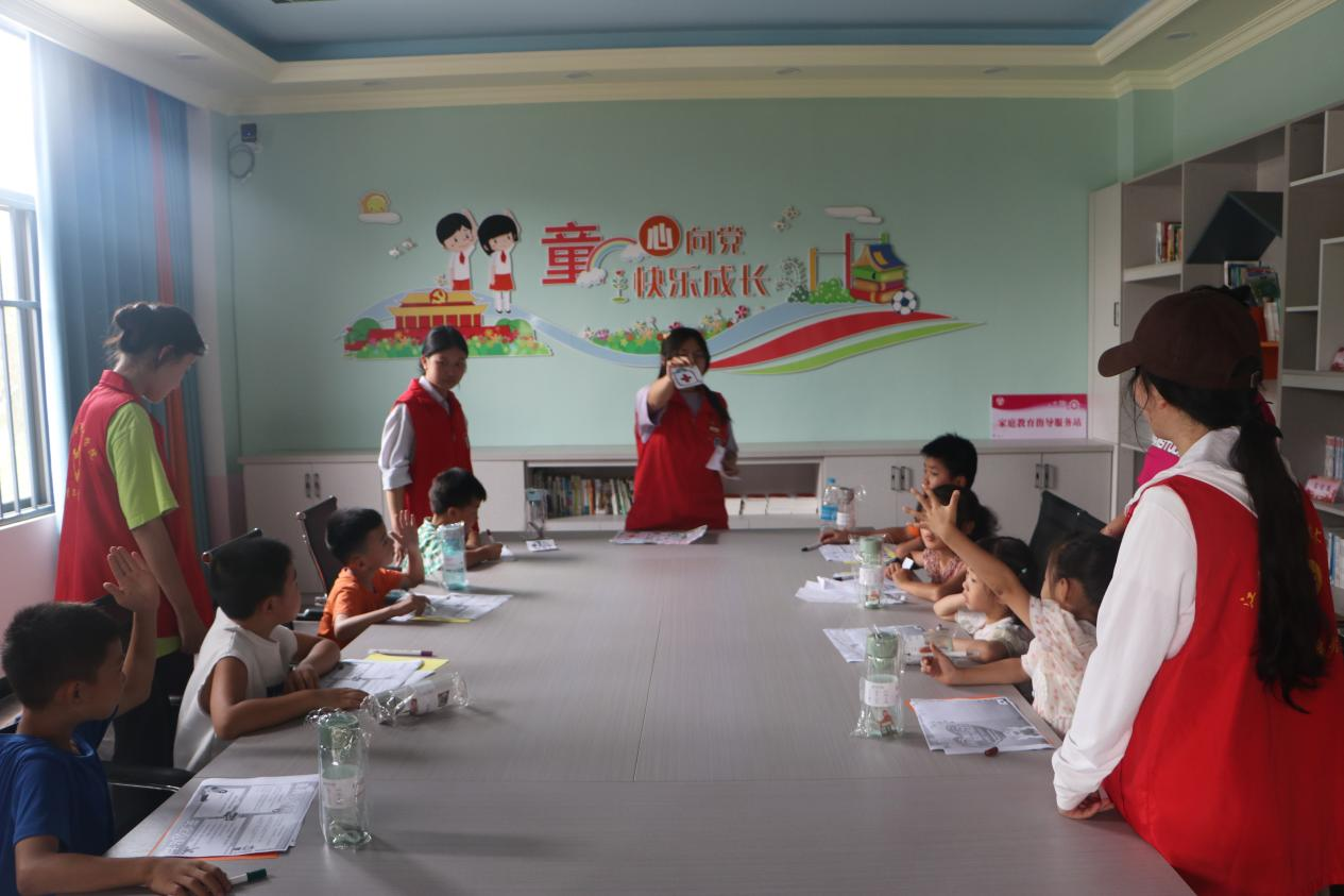 垱头村学习活动室格外热闹,只见志愿者们在活动室里给小朋友们进行暑假作业辅导、上绘画课和手工课。志愿者们与留守儿童亲切交谈,了解他们的学习成绩和假期计划等情况。小朋友们非常喜欢绘画课和手工课,认真听“小老师”们讲解,操作一丝不苟,进行制作急救知识手抄报,给小朋友们提供绘画工具和材料,鼓励大家自己动手设计和对安全急救标识涂鸦。看着孩子们个个展现出自己的“小成果”,洋溢着开心的笑容。