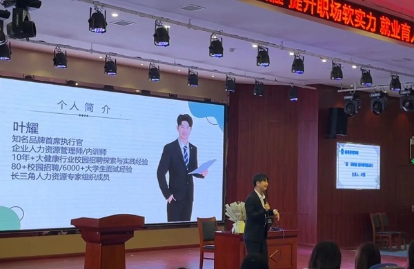 讲座以《“赢”得职涯,提升职场软实力》为主题,从危机意识、心智管理、目标管理、沟通管理、价值管理五个方面讲授。叶耀指出,身为大学生,需具备习惯意识与安全意识。习惯意识就是人要有良好的习惯,拥有好习惯对日后的学习和工作极为重要;而安全意识则是要保护好自身的人身权、财产权等权益。他提到,大学阶段正处于职业探索时期,应当紧跟时代潮流,了解掌握当下的就业政策与人才政策,在被企业面试的同时,也要懂得去面试企业。要以积极乐观的心态去面对求职,持续提升自身的能力与价值,学习更多技能,做好职业生涯规划,为自己的未来奠定坚实基础。