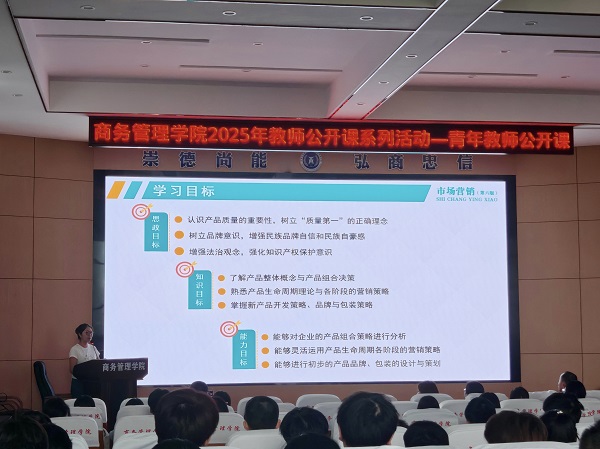 2025年5月21日下午,在新三教301教室,商务管理学院开展了青年教师公开课活动。该活动是分院2025年教师公开课系列活动之一,由青年党员教师廖璐主讲。分院院长郭斌、党支部书记唐毓林、副院长陈利华和江小美,以及分院全体教师、24级市场营销大专2班全体同学参加活动。