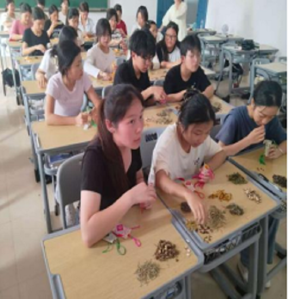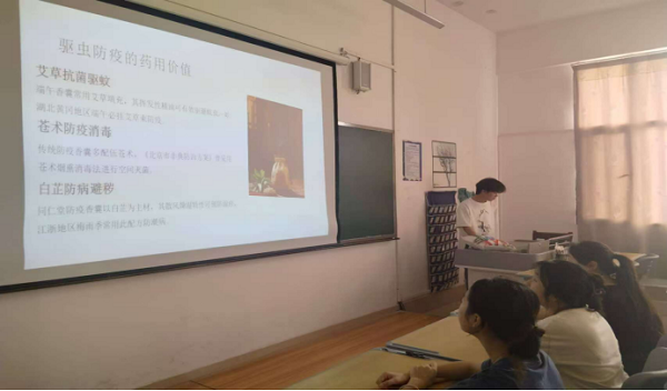 活动中,同学们围坐在摆满各种香料、中草药的课桌前,工作人员向在座的20余名同学讲解并现场演示香囊的制作方法和技巧。讲解结束后,同学们自己动手制作起来。在针线穿梭间,一个个小巧精致的香囊逐渐成形。活动现场洋溢着欢乐的气氛,大家纷纷拿起手中的香囊进行展示。