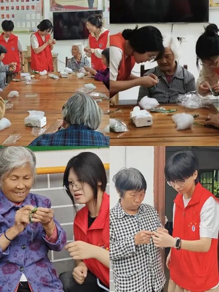 活动中,志愿者与老人们围坐在一起,制作端午香包。桌上摆满了艾草、布料、彩线等材料,大家熟练地将艾草填充进布袋。现场气氛热烈,大家互教互学,融学于趣。