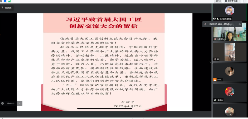 【现代服务学院徐卉报道】为喜迎“五一”劳动节,弘扬劳动精神。5月1日,现代服务学院组织青年先锋队线上学习习近平总书记致首届大国工匠创新交流大会的贺信,引起热烈反响。大家纷纷表示,要牢记嘱托,勤学苦练、深入钻研、勇于创新、敢为人先,不断提高技术技能水平,为推动高质量发展、实施制造强国战略、全面建设社会主义现代化国家贡献智慧和力量。