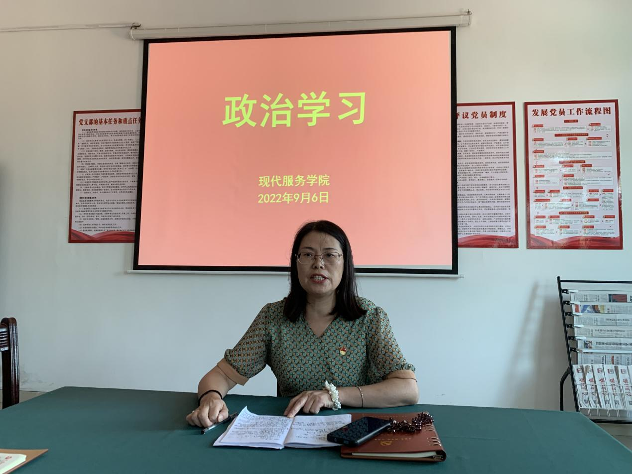 【现代服务学院廖斐报道】9月6日,现代服务学院党支部开展集中政治学习活动,会议由党支部书记欧阳小缨主持,全体教职工参加。