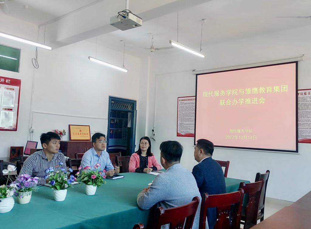 【现代服务学院郭鹏报道】为了更好地培养应用型人才,全面深化校企合作、产教融合,10月14日上午,现代服务学院与深圳雏鹰教育集团在分院二楼党员活动室,就如何深化校企合作进行交流。会议由欧阳小缨主持。