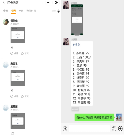 学生们在金职母婴小程序上理论答题,把做题情况截图发至教师设定的微信接龙打卡活动中,对于90分以下的同学,教师会结合学生实际情况给予有针对性的个性化辅导,并督促学生加强学习。在实操环节,学生可在宿舍自行录制实操视频,发给教师查看,教师进行线上点评与指导。为了更好的服务学生,这项工作在学院静态管理期间将持续开展。