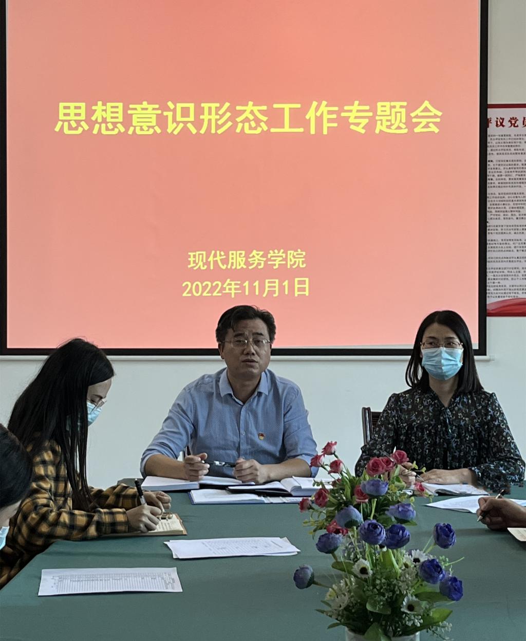 【现代服务学院廖斐报道】为进一步做好高校意识形态工作,近日,现代服务学院召开意识形态工作专题会。会议由党支部书记欧阳小缨主持,分院全体教职工参加会议。