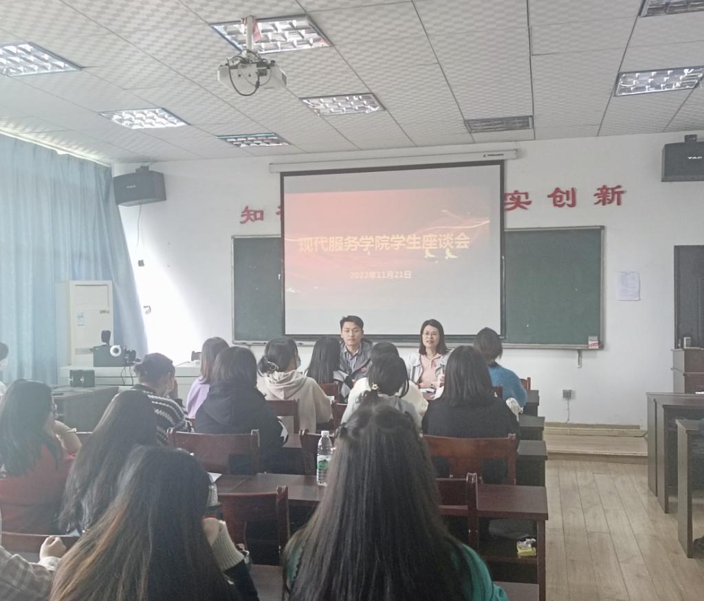 【现代服务学院郭鹏报道】11月21日下午,现代服务学院在北校区第三教学楼503多媒体教室召开学生座谈会。会议由分管学生工作的郭鹏老师主持。分院院长阮和平、党支部书记欧阳小缨出席了会议。