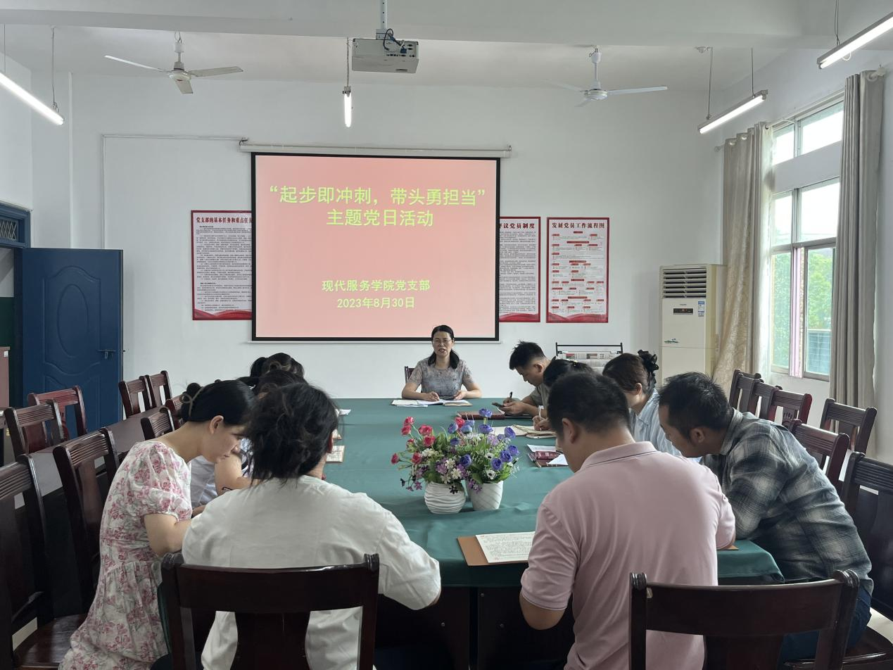 【现代服务学院廖斐报道】8月30日,现代服务学院党支部在党员活动室开展“起步即冲刺,带头勇担当”主题党日活动。活动由党支部书记欧阳小缨主持,全体党员参加。