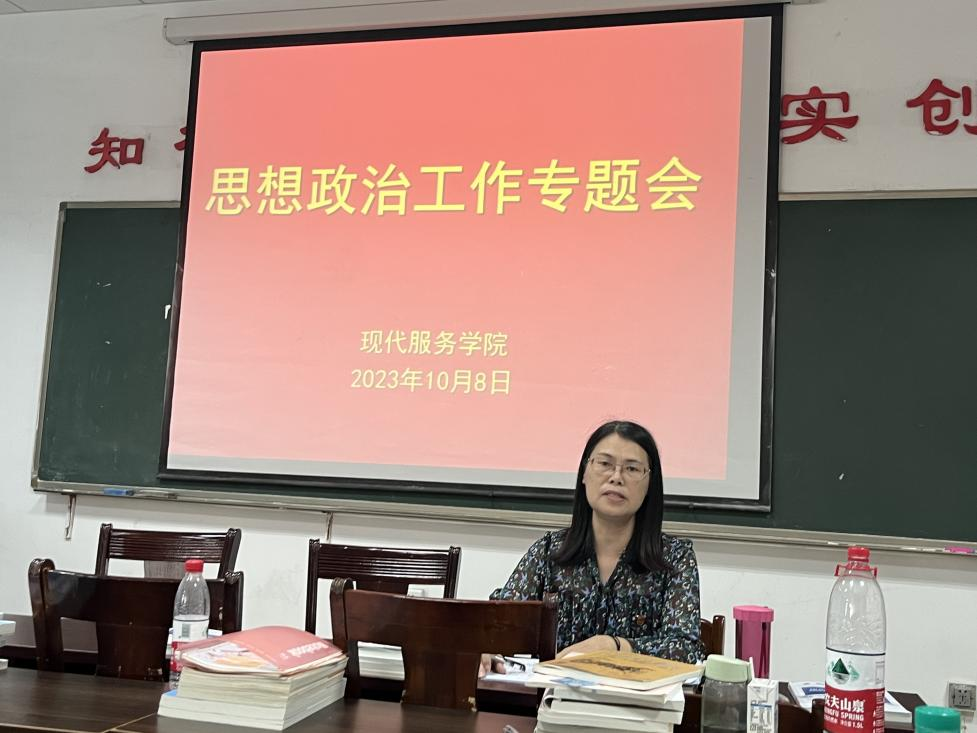 【现代服务学院廖斐报道】10月8日,现代服务学院党支部组织全体党员召开“学做结合,学以致用”思政工作研讨会,贯彻落实教育部《关于加强和改进新时代高校思想政治工作的意见》。会议由现代服务学院党支部书记欧阳小缨主持。