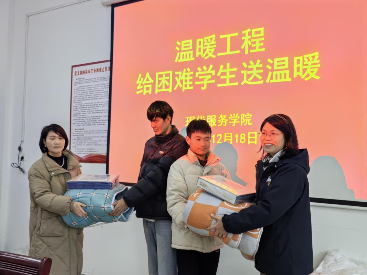 【现代服务学院周明霞报道】12月18日,现代服务学院在自强楼207教室开展了冬季慰问困难学生活动,为家庭经济困难的学生送去了一份温暖。分院党支部书记欧阳小缨、副院长江敏及专职辅导员周明霞参加了此次活动,