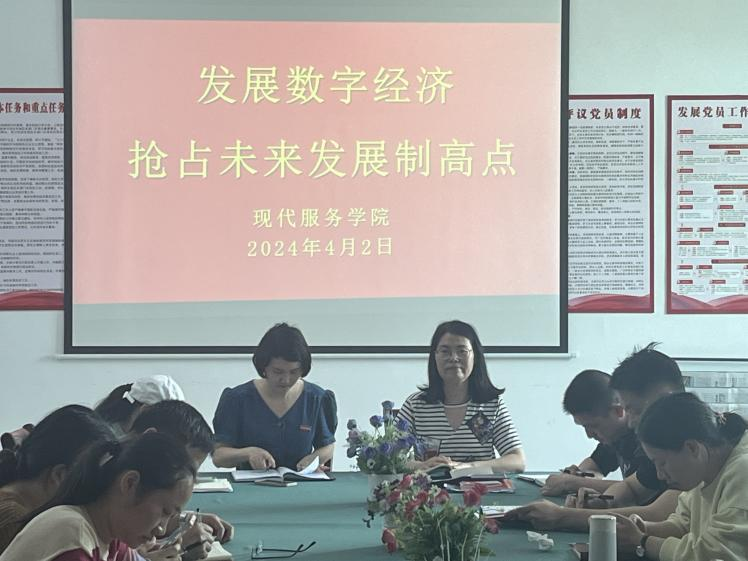 【现代服务学院文维报道】2024年4月3日,现代服务学院组织教师开展政治理论学习,重点学习《习近平著作选读》第二卷——《发展数字经济,抢占未来发展制高点》。会议由分院党支部书记欧阳小缨主持,全体教师参加。